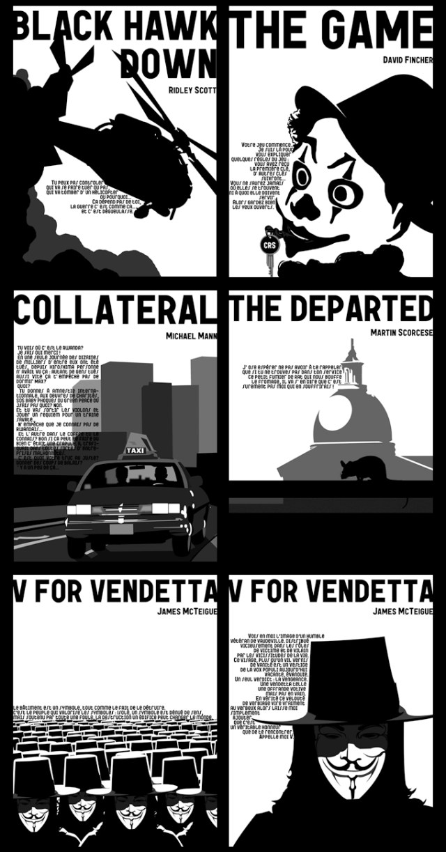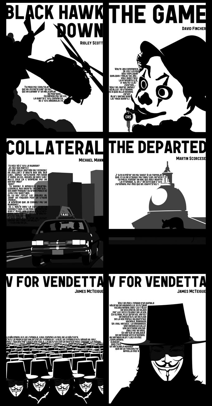 Cette fois les films illustrés étaient : Black Hawk Down (c’est la seule affiche dont j’ai expérimenté chaque technique pour le même film), The Game, Collateral, The Departed et 2 versions de V For Vendetta.
